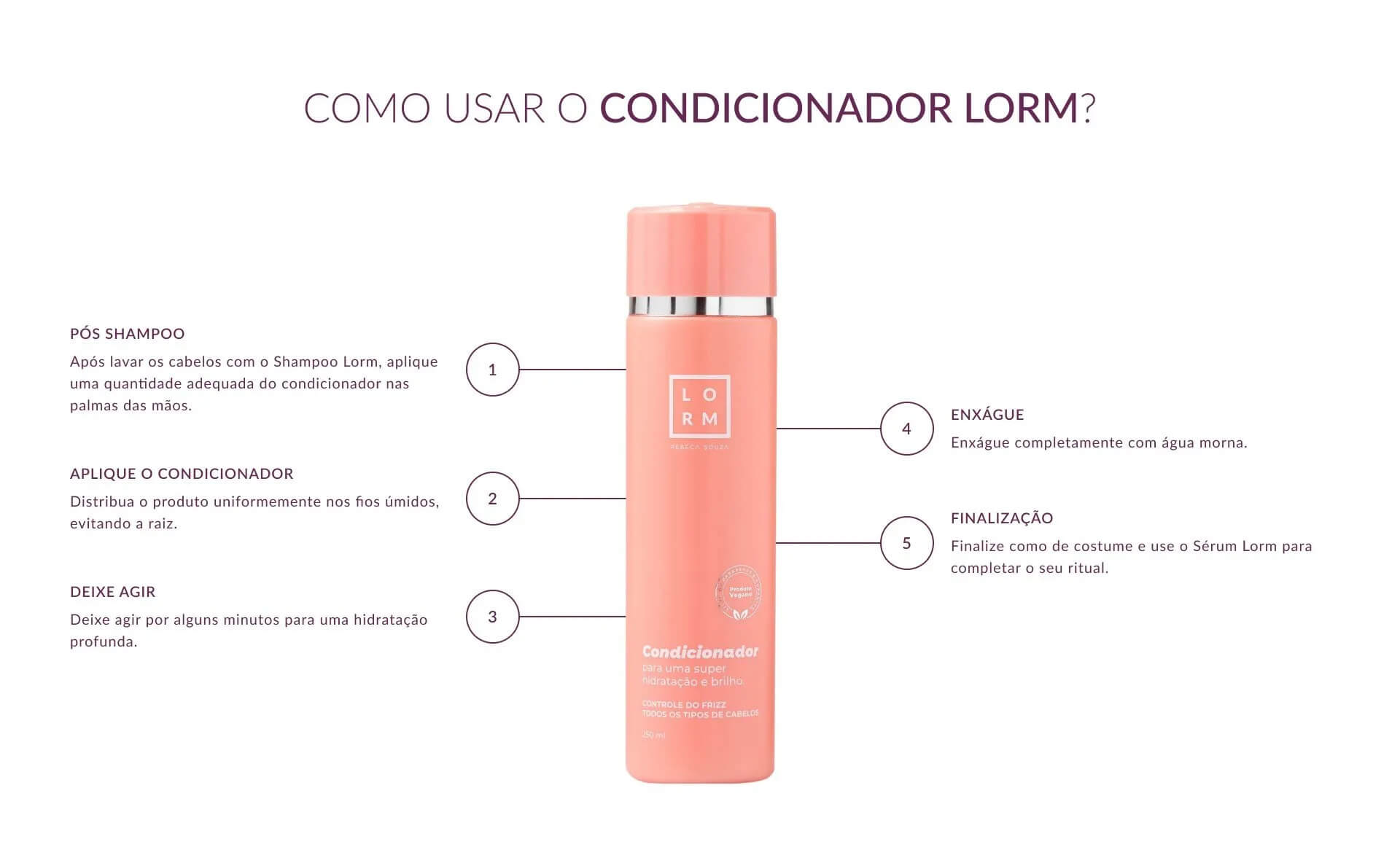 Recomendamos o uso do Condicionador Lorm sempre que lavar o cabelo, de acordo com a frequência necessária ao seu tipo de cabelo e rotina pessoal.